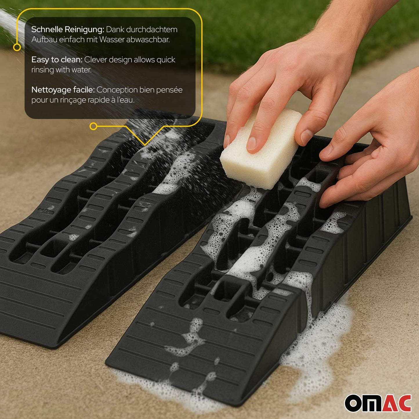 Integrierte Anti-Rutsch-Rillen bieten zusätzlichen Halt und sorgen für einen mühelosen Auf- und Abstieg. Unsere kompakten und leichten Rampen sind eine unverzichtbare Ergänzung für den Werkzeugkasten jedes wartungsbewussten Fahrzeugbesitzers.