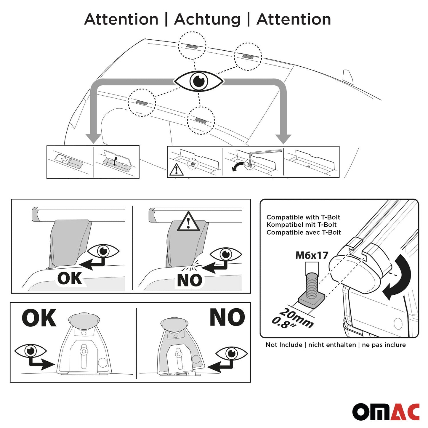 Hinweis: Der Hersteller kann nicht für Personen- oder Sachschäden haftbar gemacht werden, die auf eine unsachgemäße Montage oder Verwendung des Produkts zurückzuführen sind. Modifikationen am Produkt sind strengstens untersagt. Vergewissern Sie sich stets, dass Dachträger oder anderes Zubehör nicht das zu öffnende Schiebedach, Panoramadach oder Glasdach beeinträchtigen. Achten Sie außerdem auf die Kompatibilität mit anderem Dachzubehör, um ein nahtloses Zusammenspiel zu gewährleisten. Sicherheit und ordnungsgemäße Verwendung sind von größter Bedeutung.